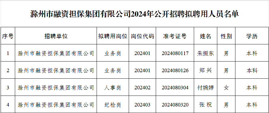 滁州市融資擔(dān)保集團(tuán)有限公司2024年公開招聘擬聘用人員公示