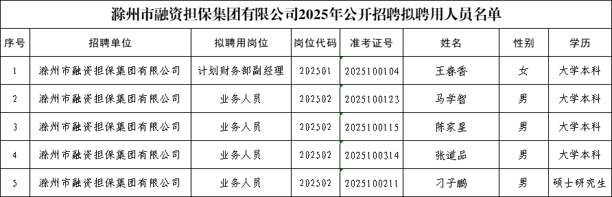 滁州市融資擔(dān)保集團(tuán)有限公司2025年公開(kāi)招聘擬聘用人員公示